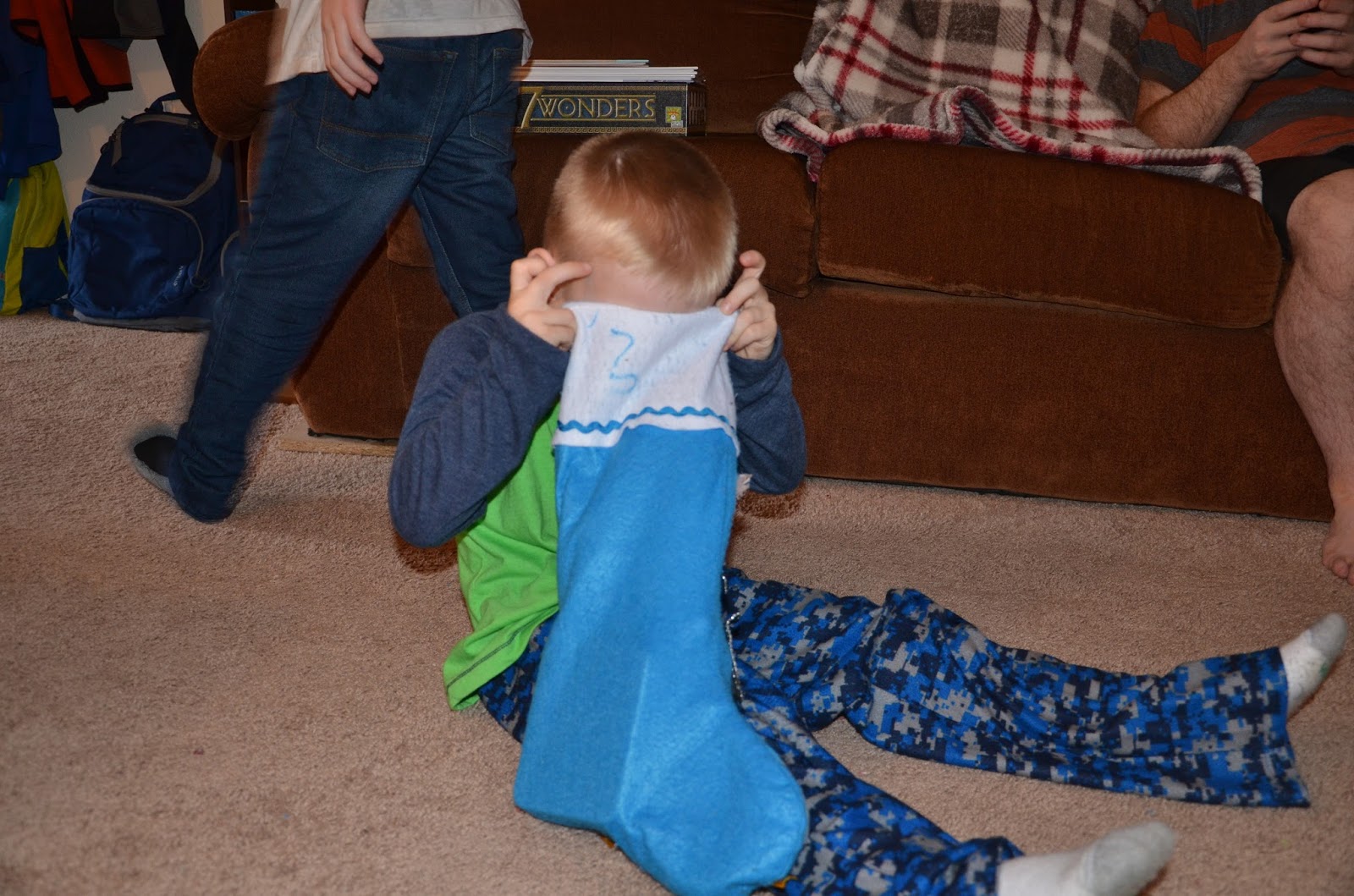 I love this picture for the inspiring story of brotherhood behind it. Misha and I had gone thrift-store shopping, and Misha picked an adorable kangaroo to give to Sebby. However, the Kangaroo was so alluring that Misha kept debating keeping the animal for himself. In the end, he wrapped it up for Sebby. Last summer, I had given Sebby my old Stitch toy (I had given Misha something else). Sebby could tell that Misha really wanted Stitch, and as Christmas approached, Sebby remembered this fact. Here they are opening their thoughtful gifts for each other!